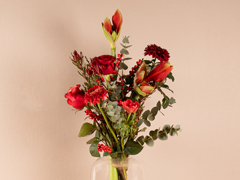 Een sierlijk warmrood plukboeket voor de feestdagen met bloemen met dennengroen en/of eucalyptus.